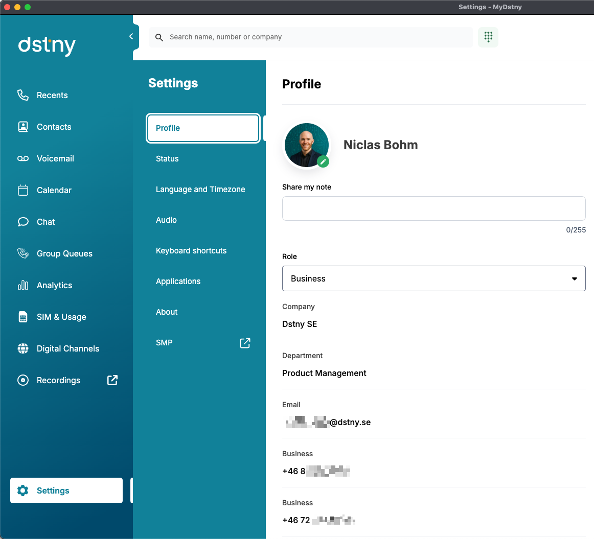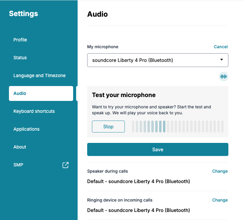 In the Settings section, you manage your profile, call settings, audio, language, and shortcuts. This allows you to tailor the experience to your needs.