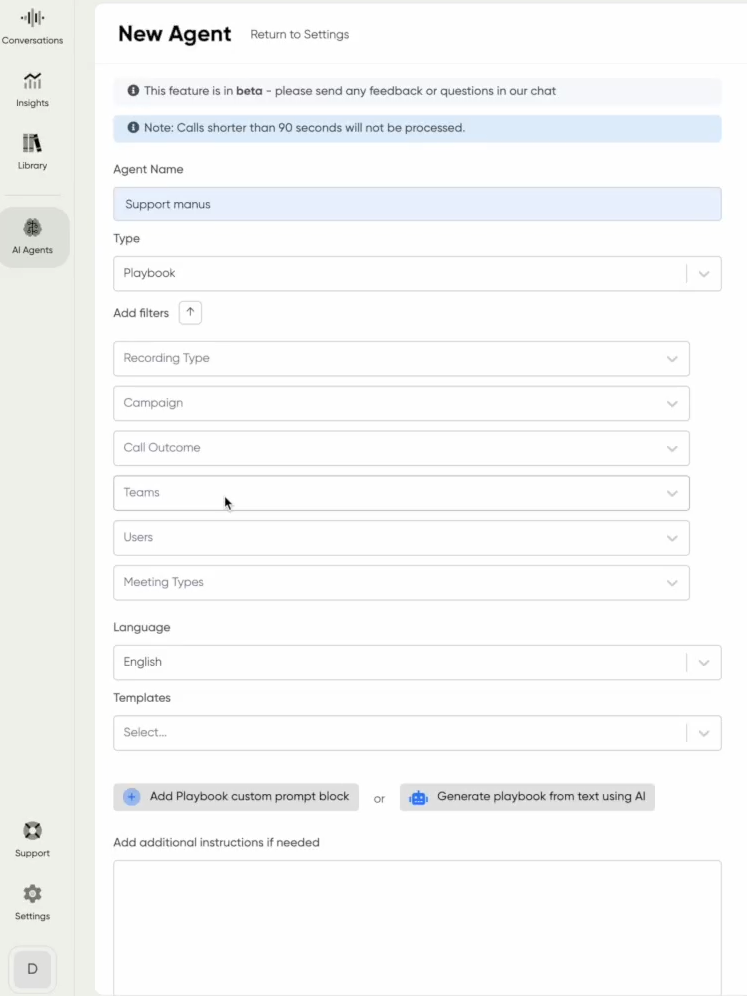âąTesta agenten pĂ„ befintliga samtal och möten innan du sparar.