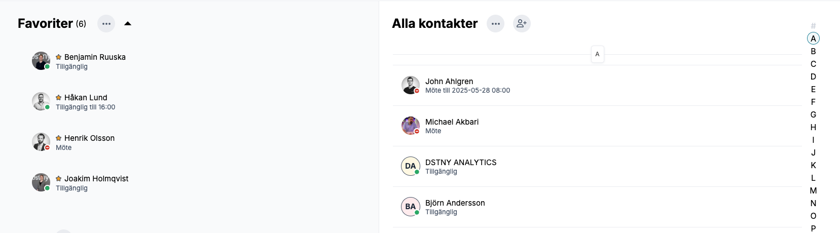 Du hittar både personliga och företagskontakter i kontaktlistan. Du kan lägga till egna kontakter, se kollegors status, favoriter, VIP och blockera nummer.