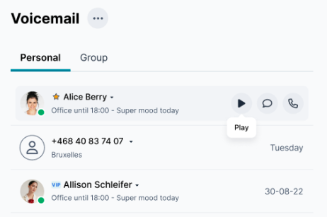 Via fliken Voicemail hanterar du dina personliga eller delade röstmeddelanden. Du kan lyssna, ta bort eller återaktivera röstbrevlådan vid behov.