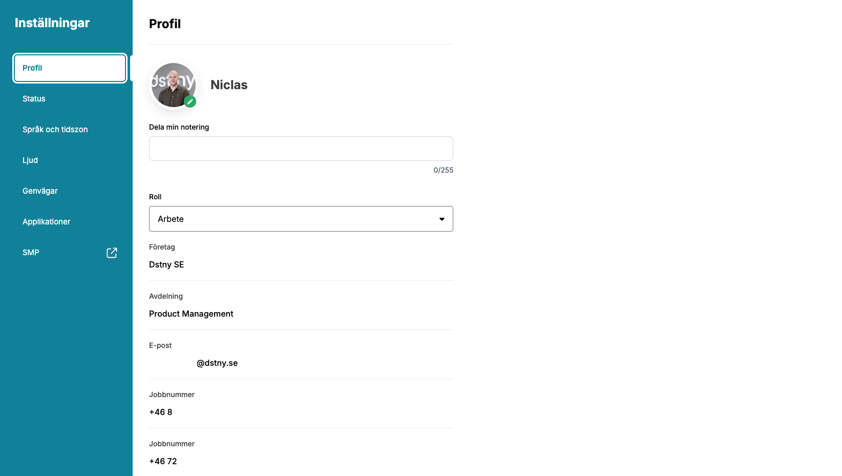 Toppmenyn – klicka på din profilbild för att ändra status, vidarekoppling eller logga ut.