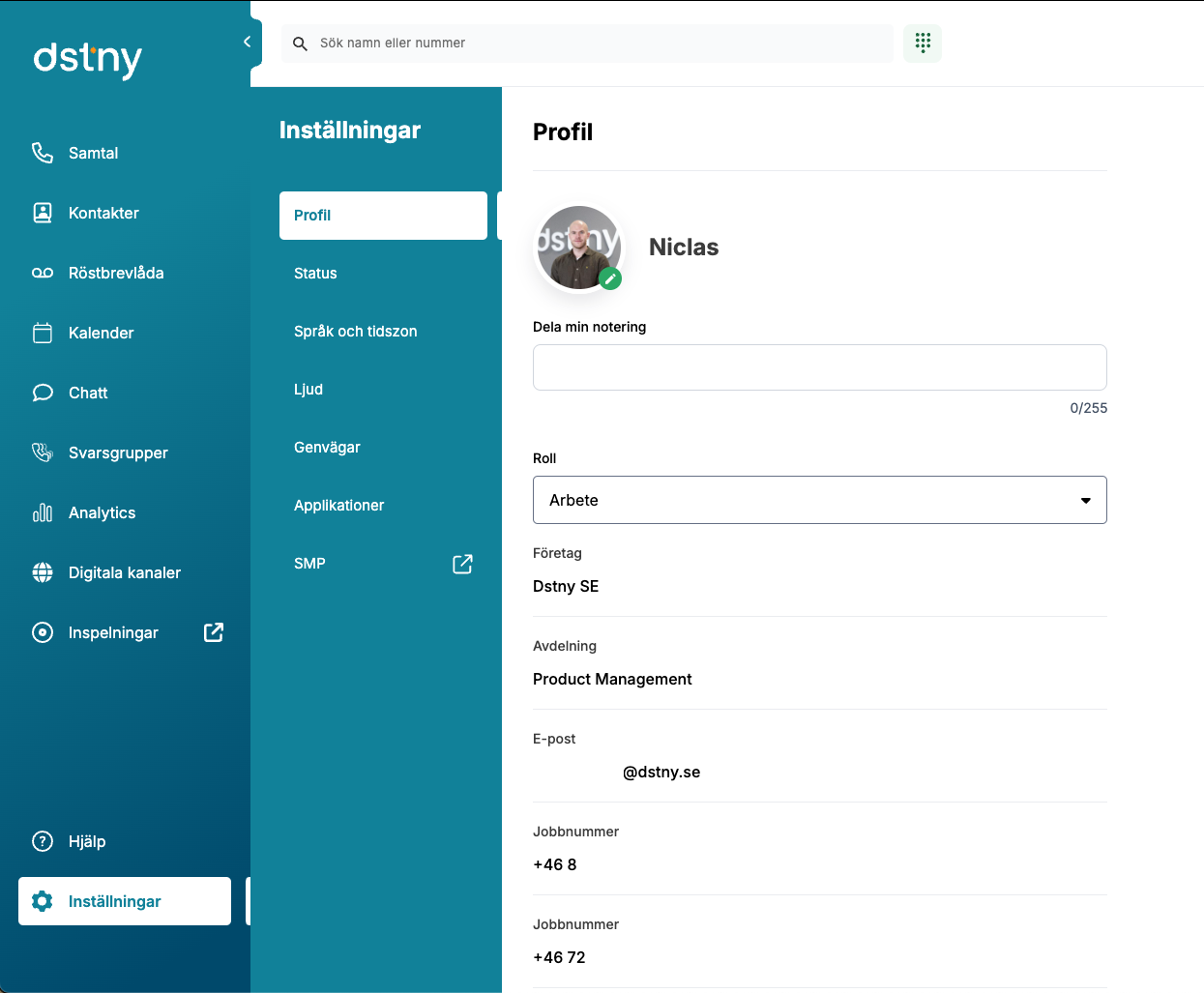 - Närvarostatus (t.ex. Tillgänglig, Upptagen)