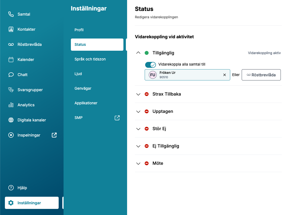 För att ställa in automatisk vidarekoppling när du har en viss status (t.ex. Möte eller Lunch), gå till Inställningar och sedan till fliken Status.