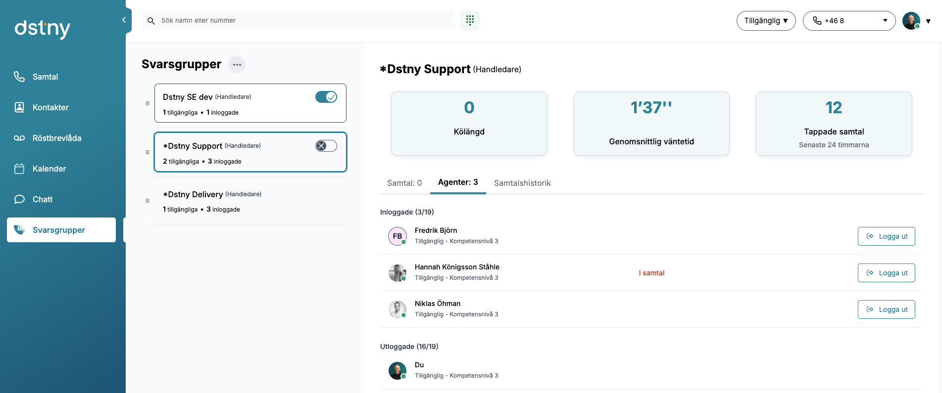 - Samtal som väntar i kö: Filtreras per vald kö eller visas samlat om ingen kö är vald.