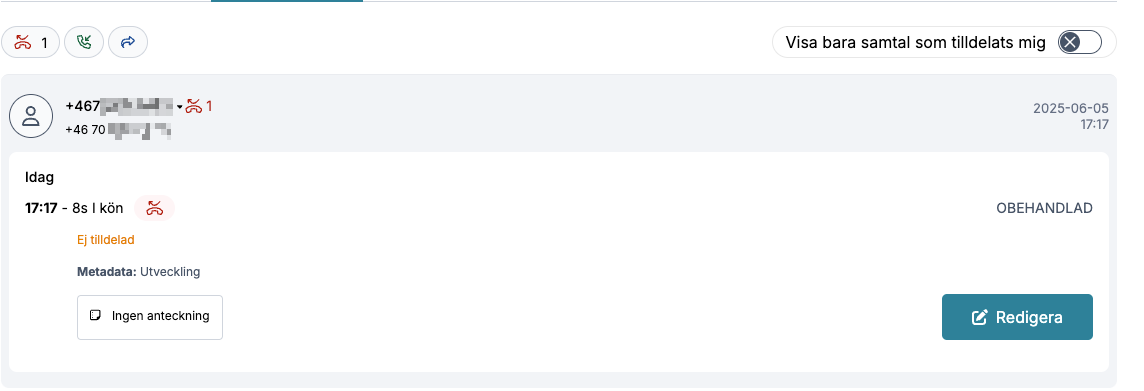 Metadata (t.ex. samtalsorsak) visas om det är aktiverat. Missade samtal kan tilldelas manuellt till agenter, med anteckning. Agenter kan också själva tilldela sig samtal.