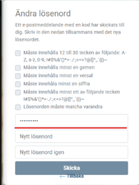Ditt nya lösenord måste innehålla minst 12 tecken totalt, inklusive: