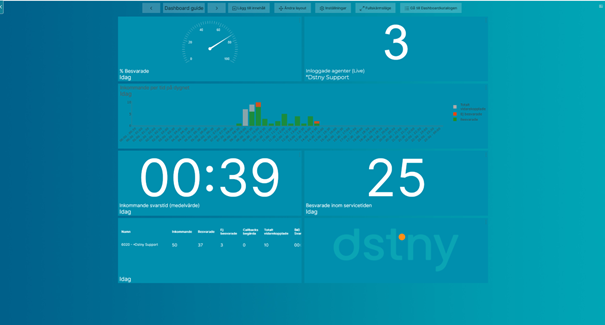 Dashboard är vår ersättare till Wallboard och ger dig statistik som uppdateras automatiskt samt realtidsdata. Du kan anpassa layouten efter era behov. Tjänsten är inbyggd i vårt rapportverktyg så att du når all statistik från samma plats.