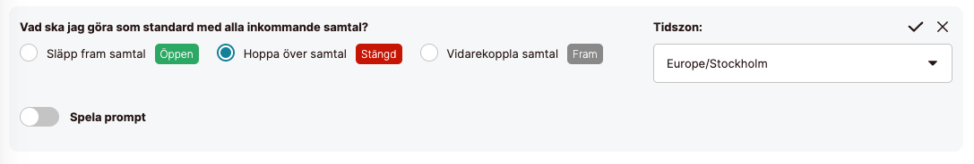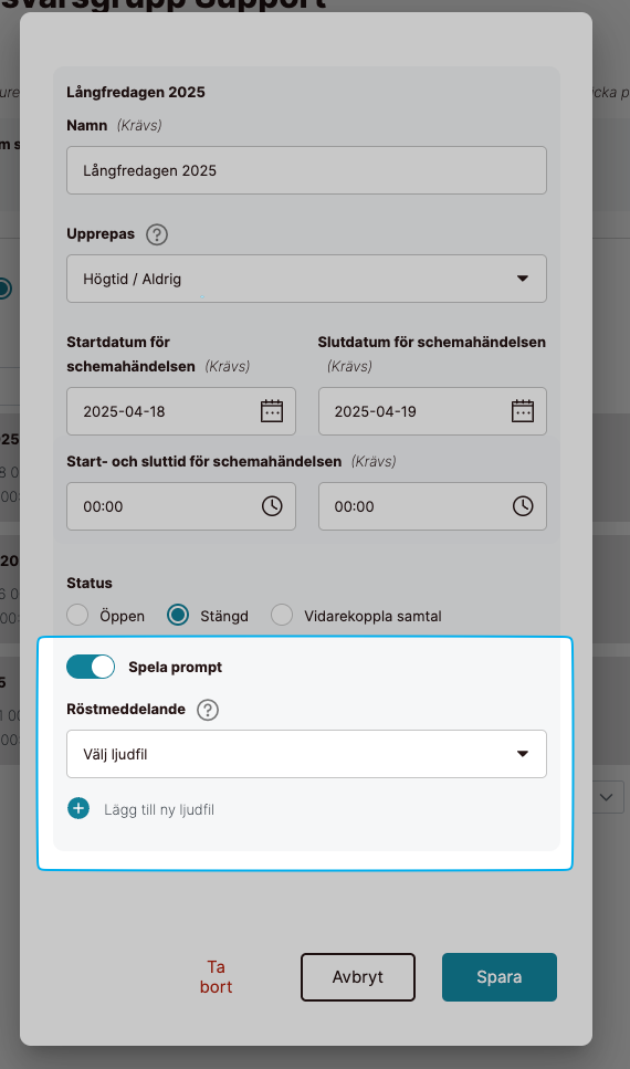 Aktivera Spela prompt. Du kan välja ett befintligt meddelande eller skapa ett nytt via Lägg till ny ljudfil