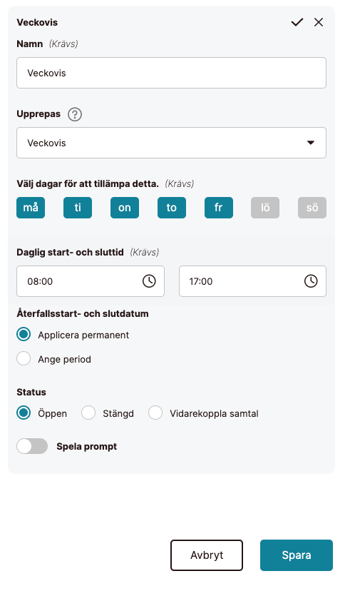 Vi rekommenderar att hålla stängt som standard och lägga till öppettider som intervall