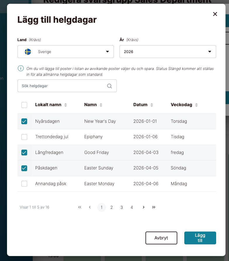 Helgdagarna läggs automatiskt till när du klickar på Lägg till.
