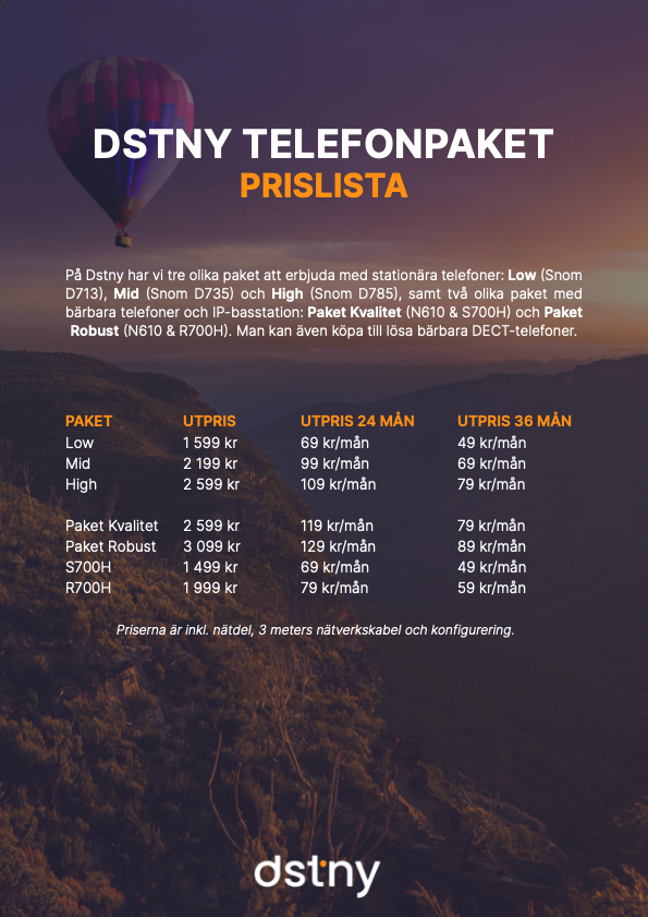 Bordstelefoner- Paket och Priser Nedan är våra olika paket och priser på bordstelefoner och dectar. Relaterad till bordstelefon gigaset dect telefoner priser pris snom Uppdaterad 17 Juli 2025 09:33 Var denna artikel till hjälp? 0 av 0 tyckte detta var till hjälp