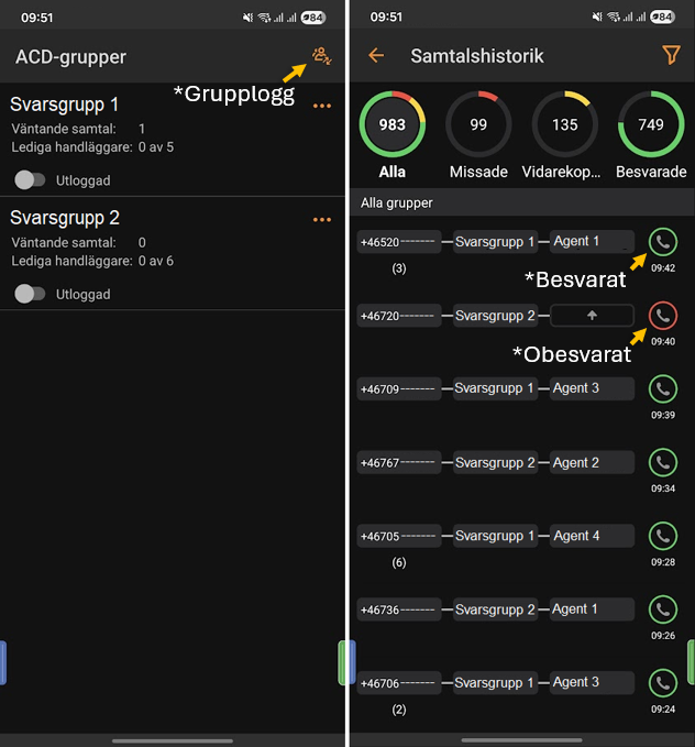 - Här kan ni se era samtal som svarsgrupperna har tagit emot. Om samtalet besvarats är ikonen till höger grön, men är det obesvarat är den röd